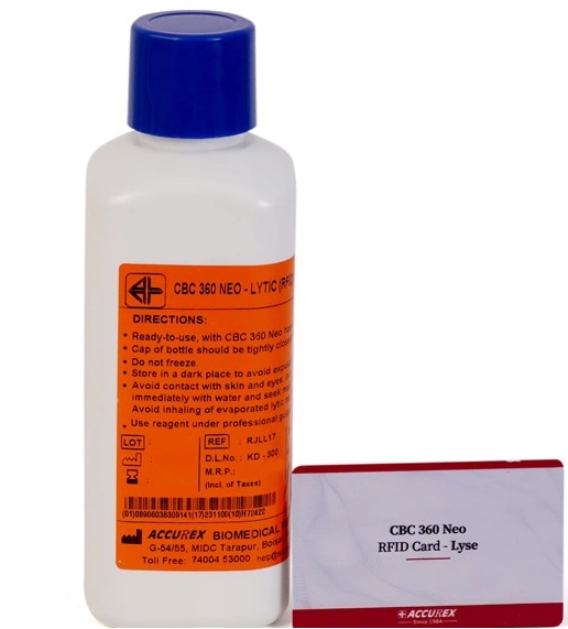 Accurex CBC 360 Neo Lytic (RFID) Reagent is a system-specific hematology reagent formulated for selective lysis of red blood cells while preserving leukocytes. It enables accurate white blood cell counting and differential analysis in the Accurex CBC 360 Neo RFID hematology analyzer.